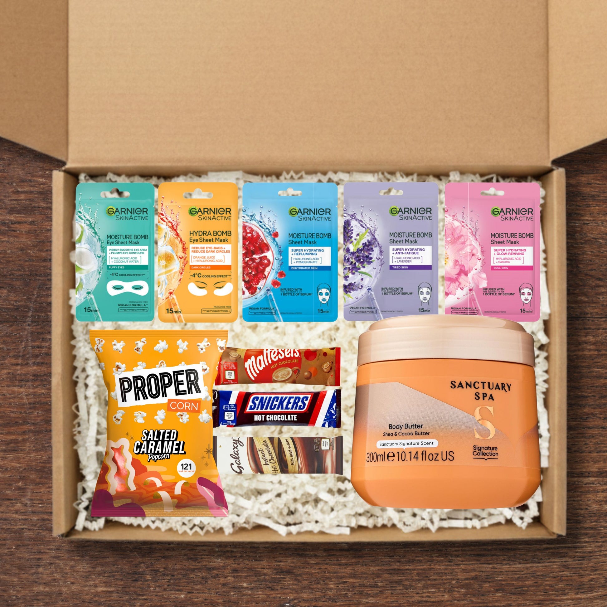 Unwind with this cosy pamper and relaxation gift set, packed with treats to help anyone switch off after a long day. Enjoy three Celebrations Hot Chocolate Sachets for a rich, indulgent drink, paired with Propercorn Salted Caramel Popcorn for the perfect sweet-salty snack. The set also includes a pack of 5 rejuvenating face masks and Sanctuary Body Cream for a soothing self-care moment.